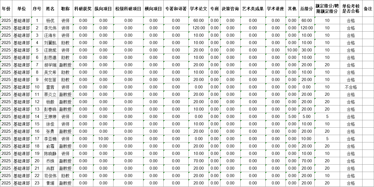 根据《武汉晴川学院教师科研工作考核办法(试行)》《基础课部教师科研工作考核办法(试行)》文件精神,参照《关于开展武汉晴川学院2025年教师科研成果统计、科研工作考核与成果奖励工作的通知》要求,基础课部2025年度科研考核采取线上自主申报与学术委员会集中审议相结合的形式进行,现将年度科研考核结果予以公示: